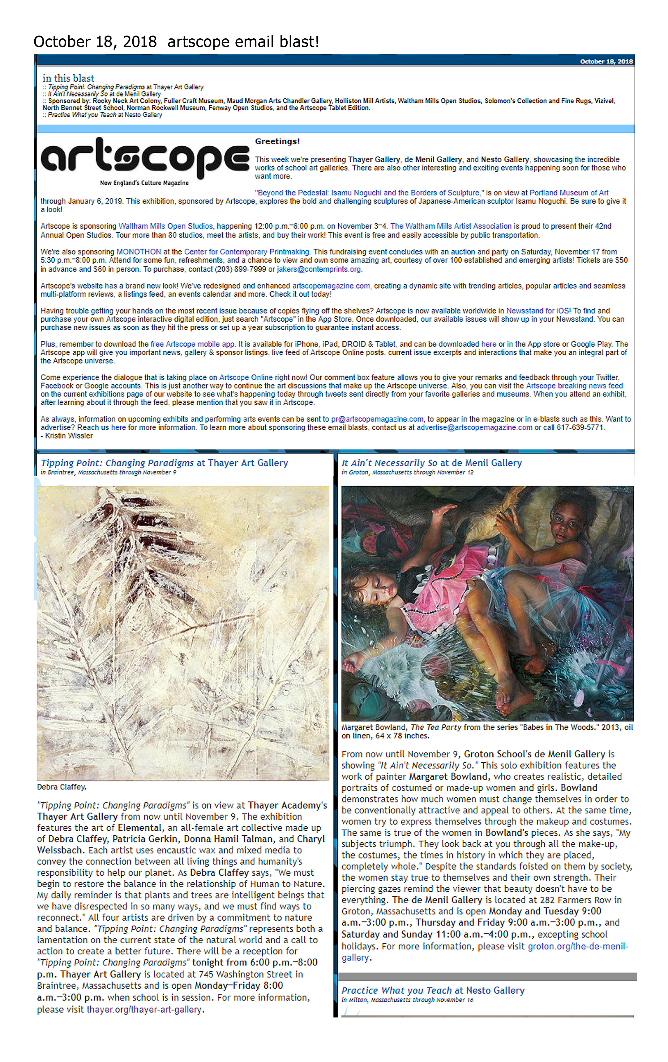 TIPPING POINTS: Changing Paradigms October 9–November 9, 2018 Artist Talk: October 18, 6-6:30PM Artist Reception: October 18, 6-8PM Thayer Academy Gallery www.thayer.org/gallery Four artists who use mixed mediums of encaustic, oil and cold wax,